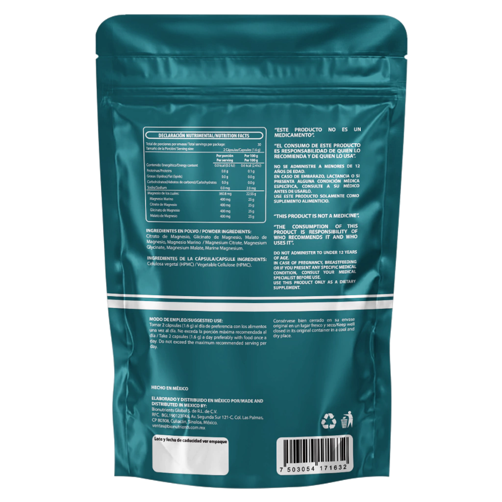 Suplemento avanzado con 4 fuentes de magnesio de alta absorción. 4 tipos de magnesio: Citrato, Glicinato, Malato y Marino; 360mg por porción; Vcaps veganas; Bottle Free