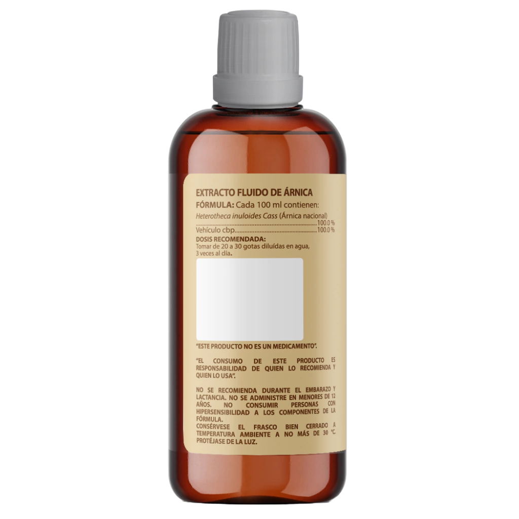 Extracto líquido de árnica, 100 ml, concentrado natural, libre de conservadores y aditivos, envase con dosificador, apto para consumo diario.