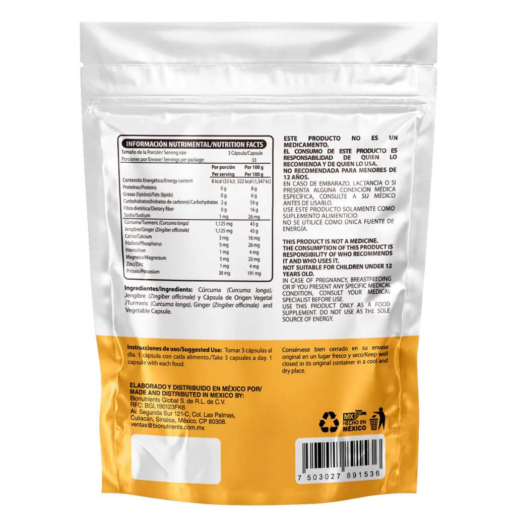 750 mg de cúrcuma + 750 mg de jengibre por porción; cápsulas veganas Vcaps; fabricado en planta certificada